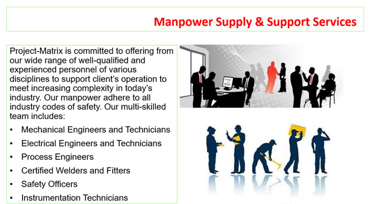 Construction Services, Engineering (Mechanical, Electrical, Civil), Instrumentation and Control Systems Service,MEP (Mechanical, Electrical & Plumbing) Services, Maintenance, Manpower Supply & Support Services, Project Management Services,Procurement Services